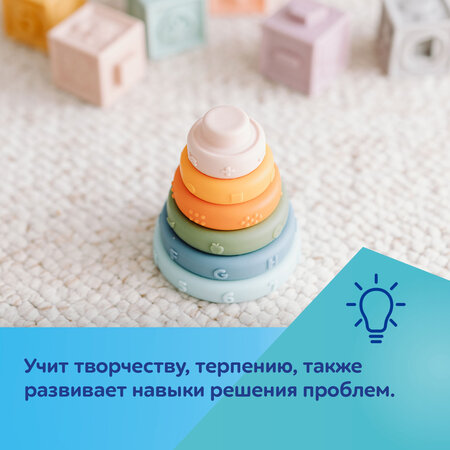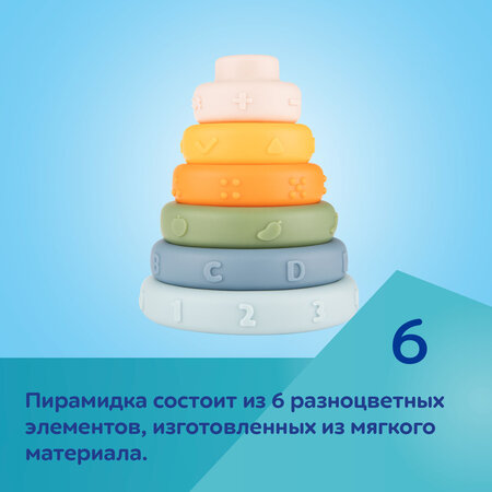 Пирамида состоит из 6 цветных элементов, изготовленных из мягкого пластика.