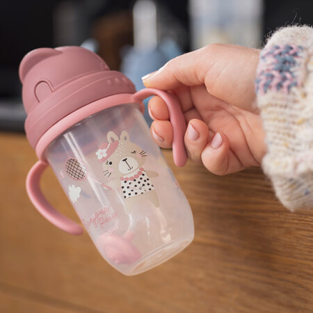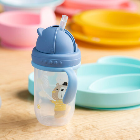 M.P: W pierwszym kubeczku rurka może być dłuższa i szersza, to pomaga dzieciom nauczyć się tego sposobu picia. Aby łatwiej przejść z picia ze smoczka.  Kiedy dziecko już radzi sobie z ta umiejętnością rurka może być już i węższa (z niej trudniej się pije, trzeba bardziej zaangażować mięsnie warg i policzków) i krótsza.
