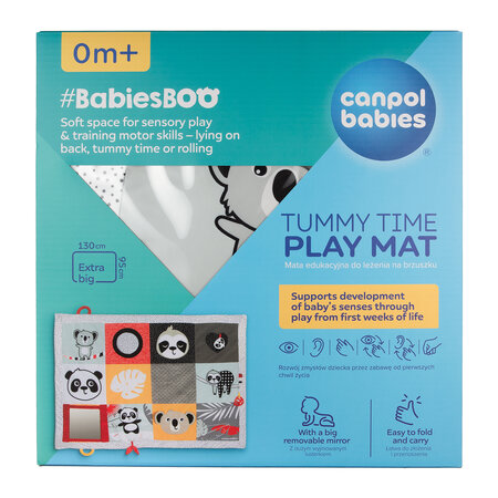 Symbol: 68/094Canpol babies sensory educational mat Tummy Time for lying on the tummy from BabiesBoo collection is a safe and pleasant way to keep the child involved and allows the parent to have some time for themselves or do household chores. The mat is exceptionally large and soft - 130 x 95 cm will provide your little one with comfort and safety. Canpol babies educational mat is easy to fold with a comfortable handle, which makes it easy to carry, so you can create a child's space wherever you need it. Large mirror encourages and extends tummy time, during which the baby can explore different parts of the mat every time. The large number of sensory elements engage the child's senses: sight, hearing and touch. Various material textures, contrasting colors and patterns, and gentle sounds are great entertainment for your baby's developing senses from the first moments of life. Canpol babies sensory educational mat will help ensure the proper motor skills of every child. The mat is machine washable.