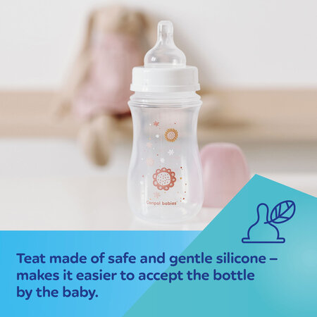 Fľaša je vhodná pre elektrickú odsávačku mlieka Easy&Natural, elektrickú odsávačku mlieka EasyStart a ručnú odsávačku mlieka Basic. Možnosť priameho odsávania do fľaše uľahčuje bezpečné kŕmenie dieťaťa čerstvo odsatým materským mliekom. K dispozícii vo viacerých farebných variantoch. Fľaša sa môže dezinfikovať a ohrievať v mikrovlnnej rúre (fľaša musí byť otvorená). Fľaša sa môže umývať v umývačke (max. teplota 65 ℃). Cumlík sa neodporúča vkladať do umývačky riadu. Ovocné šťavy alebo čaje môžu zanechať na fľaši alebo cumlíku usadeniny alebo spôsobiť zafarbenie, ktoré nemení vlastnosti výrobku. Fľaša bola vyrobená v Európskej únii. POZNÁMKA! Značka Canpol babies odporúča dojčenie ako najzdravšiu formu kŕmenia. Odporúča sa začať podávať mlieko v alternatívnej forme až po konzultácii s lekárom, pôrodnou asistentkou alebo lekárnikom, keď dojčenie nie je možné alebo je nedostatočné.