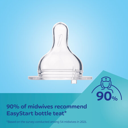 Antikoliková fľaša EasyStart. Pred prvým a každým použitím umyte všetky časti výrobku a vydezinfikujte ich. Vložte na 5 minút do vriacej vody. Tým sa zabezpečí hygiena. Pred každým použitím vyčistite. Vyváranie a tvrdá voda môžu spôsobovať usadzovanie vodného kameňa. Všetky časti dôkladne umyte čistou vodou vrátane oblastí, ktoré môžu byť neviditeľné, ale ktorými prešlo jedlo, aby ste odstránili všetky zvyšky jedla. Po použití odstráňte zvyšky jedla z fľaše a cumlíka, opláchnite, umyte a vydezinfikujte v parnom/elektrickom sterilizátore alebo vo vriacej vode. Fľaša sa môže umývať v umývačke (max. teplota 65 ℃). Cumlík sa neodporúča vkladať do umývačky riadu. Silné chemikálie/čistiace prostriedky môžu výrobok poškodiť. Nepoužívajte antibakteriálne prostriedky. Pred každým použitím skontrolujte cumlík na kŕmenie a natiahnite ho vo všetkých smeroch. Predovšetkým ak má dieťa zuby. Pri prvých známkach poškodenia alebo oslabenia výrobok prestaňte používať. Uzatvárací krúžok fľaše neuťahujte, pretože by mohlo dôjsť k narušeniu odvetrávania cumlíka. Vždy skontrolujte, či nedochádza k úniku. Nikdy žiadnym spôsobom nezväčšujte prietokové otvory cumlíka, pretože cumlík by sa mohol poškodiť. Pri zohrievaní v mikrovlnnej rúre postupujte obzvlášť opatrne. Ohriate jedlo vždy premiešajte, aby sa zabezpečilo rovnomerné rozloženie teploty, a pred podaním dieťaťu skontrolujte teplotu tekutiny. Pri zohrievaní jedla v mikrovlnnej rúre nezabudnite nechať fľašu otvorenú. Produkt nevkladajte do horúcej rúry ani nezohrievajte na plynovom/elektrickom sporáku. Cumlík na kŕmenie nenechávajte na priamom slnku alebo horúcom mieste ani v dezinfekčných prostriedkoch („sterilizačný roztok“) dlhšie, ako sa odporúča, pretože to môže oslabiť špičku. Odporúča sa vymeniť cumlík max. po 2 mesiacoch používania. Fľaša je z polypropylénu.