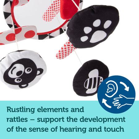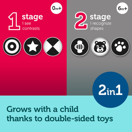 Má 12 rôznych príjemných melódií pre dieťa. Veľké zrkadlo je ďalším lákadlom – každé dieťa sa rado pozerá okolo seba a pozoruje svet. Obojstranné magnetické prvky sú navrhnuté tak, aby rástli spolu s dieťaťom. Umožňujú otočiť obojstranné hračky a prispôsobiť ich vývoju vášho dieťaťa. Počas prvých mesiacov života sú tieto prvky skvelé vďaka svojim kontrastom a veľkým geometrickým vzorom, ktoré vaše dieťa vidí v počiatočnom štádiu vývoja. Keď dieťa dosiahne 6. mesiac veku, zložitejšie tvary, ako napríklad medvedík, včela alebo labka určite upútajú jeho pozornosť a povzbudia ho k hraniu. Každá hračka obsahuje inú atrakciu pre dieťa: šuštivé prvky, pískadlá, hrkálku. Hračky sa dajú oddeliť a dať dieťaťu na hranie. Sú mäkké a príjemné na dotyk. Určené pre deti hneď od narodenia.