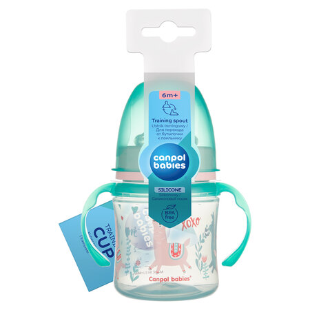 Na pohár je vhodný silikónový náustok Canpol babies 56/600. Odstránením držadiel môžete u starších detí pohár ľahko zmeniť na fľašu na vodu.