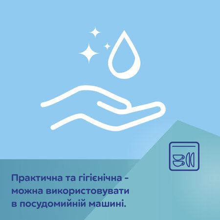 Можна мити в посудомийній машині. Не підходить для дезінфекції та підігрівання в мікрохвильовій печі.