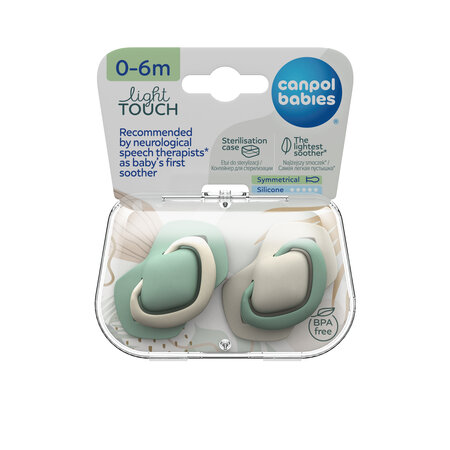 Символ: 22/655_beiРекомендовано фахівцями, як першу дитячу пустушку.* Light touch пустушки були створені, щоб забезпечити максимальний комфорт для найменших діток. Їхня надзвичайно м’яка силіконова гума вимагає менше зусиль при смоктанні, і легка профільована основа не обтяжує прикус дитини і гарантує легке дихання, що за словами фахівців, має значний вплив на правильний розвиток ротової порожнини дитини.** Завдяки сучасному футляру, який можна використовувати, як для зберігання, так і для швидкої та зручної дезінфекції в мікрохвильовій печі, ви можете легко підтримувати в чистоті пустушки Light touch. Трохи води і 2 хв достатньо, щоб забезпечити пустушку гігієнічною чистотою. Light touch пустушки доступні в декількох колекціях згідно з унікальними останніми тенденціями і в різних розмірах - вони ростуть разом з вашою дитиною. *88% неврологів-логопедів рекомендують Light touch пустушку, як першу дитячу пустушку. На основі дослідження в групі з 25 неврологів-логопедів, яке було організовано компанією Canpol у 2020 році. **На думку 93% неврологів-логопедів, легка основа має значний вплив на розвиток ротової порожнини дитини. На основі дослідження в групі з 25 неврологів-логопедів, яке було організовано компанією Canpol у 2020 році.